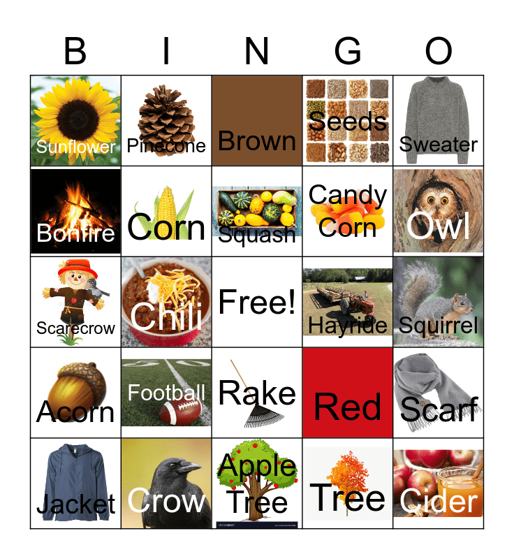 This bingo card has 34 images, a free space and 34 words: Leaves, Tree, Pumpkin, Apple, Acorn, Corn, Sweater, Jacket, Pinecone, Harvest, Squash, Brown, Yellow, Orange, Hayride, Owl, Crow, Scarecrow, Football, Red, Rake, Gourd, Sunflower, Squirrel, Apple Tree, Cider, Seeds, Cornstalk, Candy Corn, Bonfire, Frost, Chili, Scarf and Chestnuts.