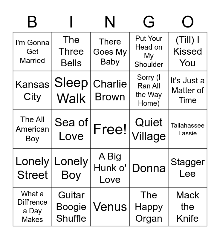 This bingo card has a free space and 50 words: The Battle of New Orleans, Mack the Knife, Personality, Venus, Lonely Boy, Dream Lover, The Three Bells, Come Softly to Me, Kansas City, Mr. Blue, Sleep Walk, Put Your Head on My Shoulder, Stagger Lee, Donna, Pink Shoe Laces, Smoke Gets in Your Eyes, Charlie Brown, Quiet Village, My Heart Is an Open Book, (Till) I Kissed You, Sea of Love, The Happy Organ, I'm Gonna Get Married, Sorry (I Ran All the Way Home), A Teenager in Love, Sixteen Candles, It's Just a Matter of Time, Lipstick on Your Collar, There Goes My Baby, A Big Hunk o' Love, Red River Rock, Waterloo, Lavender Blue, (Now and Then There's) A Fool Such as I, Guitar Boogie Shuffle, Teen Beat, Kookie, Kookie (Lend Me Your Comb), Tragedy, My Happiness, Tallahassee Lassie, Tiger, Never Be Anyone Else But You, Don't You Know?, I Need Your Love Tonight, What a Diff'rence a Day Makes, The All American Boy, Primrose Lane, Alvin's Harmonica, Lonely Street and What'd I Say.