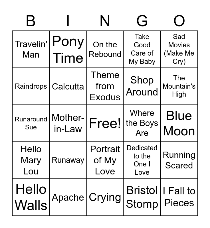 This bingo card has a free space and 50 words: Tossin' and Turnin', I Fall to Pieces, Michael, Crying, Runaway, My True Story, Pony Time, Wheels, Raindrops, Wooden Heart, Calcutta, Take Good Care of My Baby, Running Scared, Dedicated to the One I Love, Last Night, Will You Love Me Tomorrow, Theme from Exodus, Where the Boys Are, Hit the Road Jack, Sad Movies (Make Me Cry), Mother-in-Law, Bristol Stomp, Travelin' Man, Shop Around, The Boll Weevil Song, A Hundred Pounds of Clay, The Mountain's High, Don't Worry, On the Rebound, Portrait of My Love, Quarter to Three, Who Put the Bomp (in the Bomp, Bomp, Bomp), Calendar Girl, I Like It Like That, Apache, Don't Bet Money Honey, Without You, Wings of a Dove, Little Sister, Blue Moon, Daddy's Home, This Time, (I Don't Know Why) But I Do, Asia Minor, Hello Walls, Runaround Sue, Yellow Bird, Hurt, Hello Mary Lou and There's a Moon Out Tonight.
