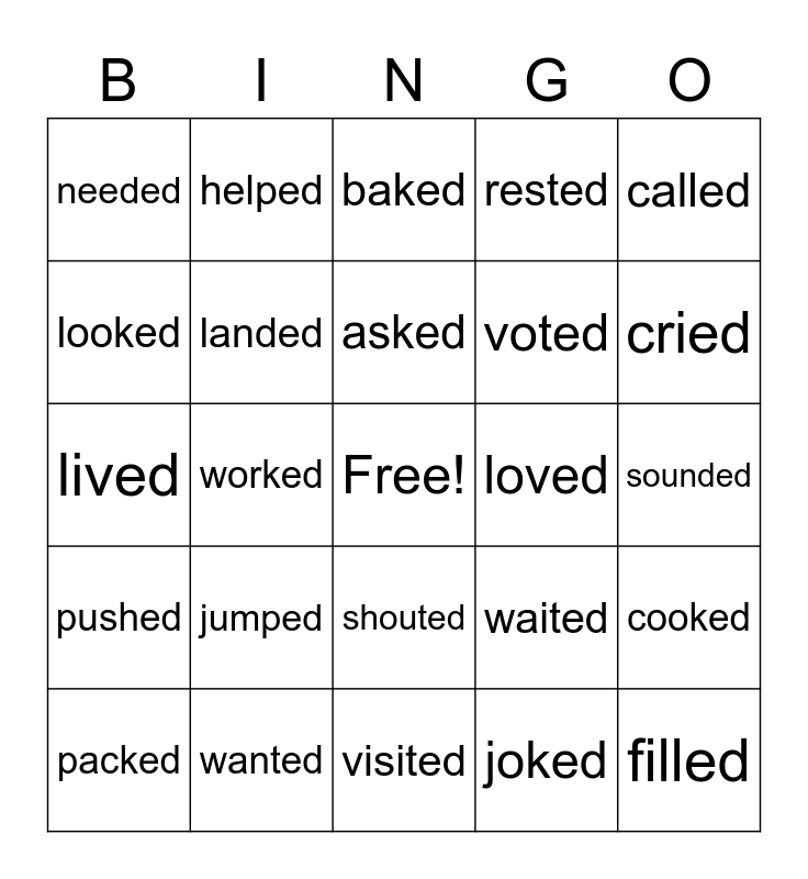 This bingo card has a free space and 24 words: jumped, wanted, asked, packed, called, needed, looked, helped, loved, shouted, voted, lived, waited, cooked, landed, joked, sounded, baked, cried, worked, filled, pushed, rested and visited.