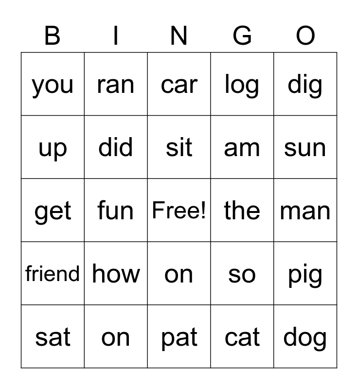 This bingo card has a free space and 24 words: how, on, sit, sat, dig, you, up, ran, the, on, am, get, so, pig, did, cat, man, car, sun, fun, dog, friend, log and pat.