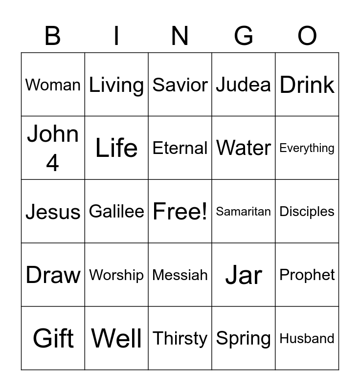 This bingo card has a free space and 24 words: Worship, Well, Eternal, Gift, Drink, Woman, John 4, Living, Samaritan, Messiah, Water, Jesus, Jar, Prophet, Life, Spring, Disciples, Savior, Everything, Galilee, Husband, Draw, Judea and Thirsty.