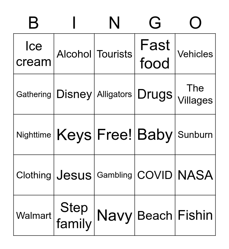 This bingo card has a free space and 24 words: Jesus, Step family, Alligators, Walmart, Vehicles, Ice cream, Gathering, Alcohol, Baby, Gambling, Drugs, Nighttime, COVID, NASA, Disney, Beach, Sunburn, Tourists, The Villages, Keys, Fishin, Clothing, Fast food and Navy.