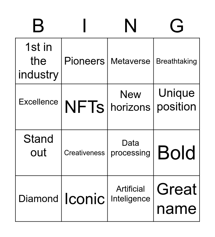 This bingo card has 16 words: Iconic, Bold, Metaverse, 1st in the industry, Stand out, Pioneers, Data processing, Artificial Inteligence, Excellence, NFTs, Diamond, Breathtaking, Creativeness, Unique position, New horizons and Great name.