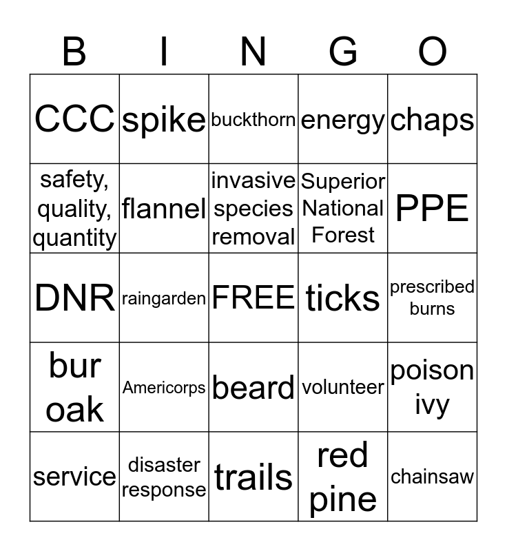 This bingo card has a free space and 24 words: Americorps, disaster response, invasive species removal, service, chaps, CCC, safety, quality, quantity, spike, ticks, beard, Superior National Forest, DNR, volunteer, poison ivy, flannel, red pine, prescribed burns, buckthorn, PPE, raingarden, chainsaw, bur oak, energy and trails.