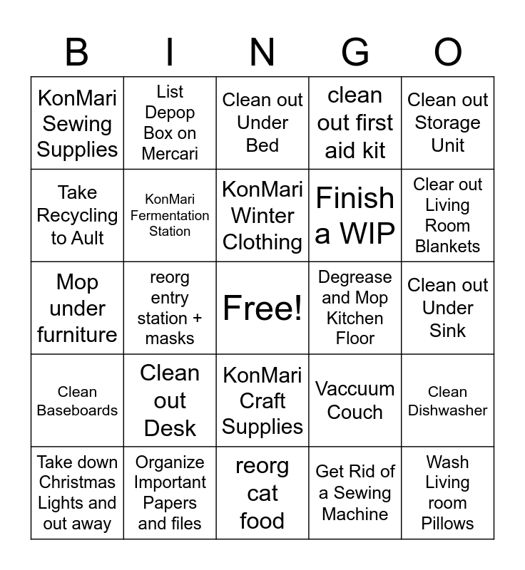 This bingo card has a free space and 24 words: Clean out Desk, Organize Important Papers and files, KonMari Winter Clothing, Take down Christmas Lights and out away, Clean out Storage Unit, KonMari Sewing Supplies, Take Recycling to Ault, List Depop Box on Mercari, Degrease and Mop Kitchen Floor, KonMari Craft Supplies, Finish a WIP, Mop under furniture, Vaccuum Couch, Clean Dishwasher, KonMari Fermentation Station, Get Rid of a Sewing Machine, Clean out Under Sink, Clean out Under Bed, Clear out Living Room Blankets, reorg entry station + masks, Wash Living room Pillows, Clean Baseboards, clean out first aid kit and reorg cat food.