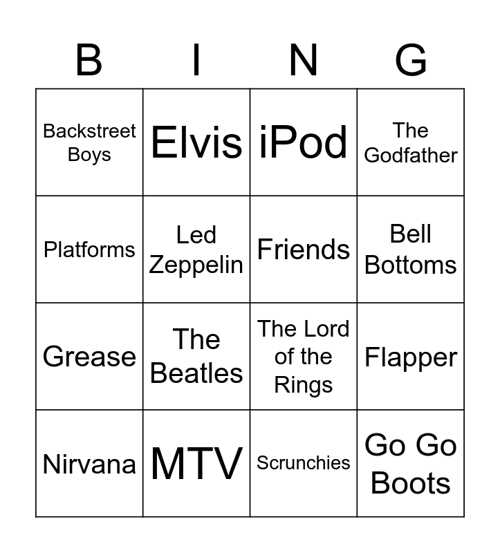This bingo card has 16 words: MTV, Flapper, iPod, Backstreet Boys, Grease, Elvis, The Lord of the Rings, Scrunchies, Platforms, Led Zeppelin, Nirvana, The Godfather, The Beatles, Bell Bottoms, Friends and Go Go Boots.