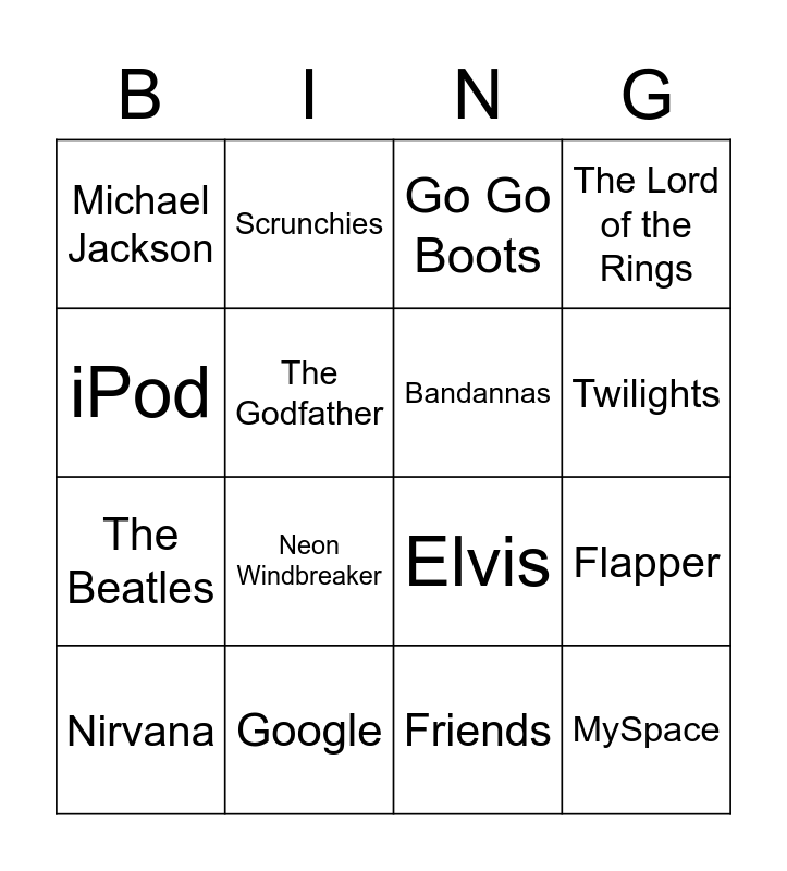 This bingo card has 16 words: Google, Flapper, Go Go Boots, Michael Jackson, The Beatles, Scrunchies, Elvis, Friends, iPod, The Godfather, Nirvana, The Lord of the Rings, Neon Windbreaker, Twilights, Bandannas and MySpace.
