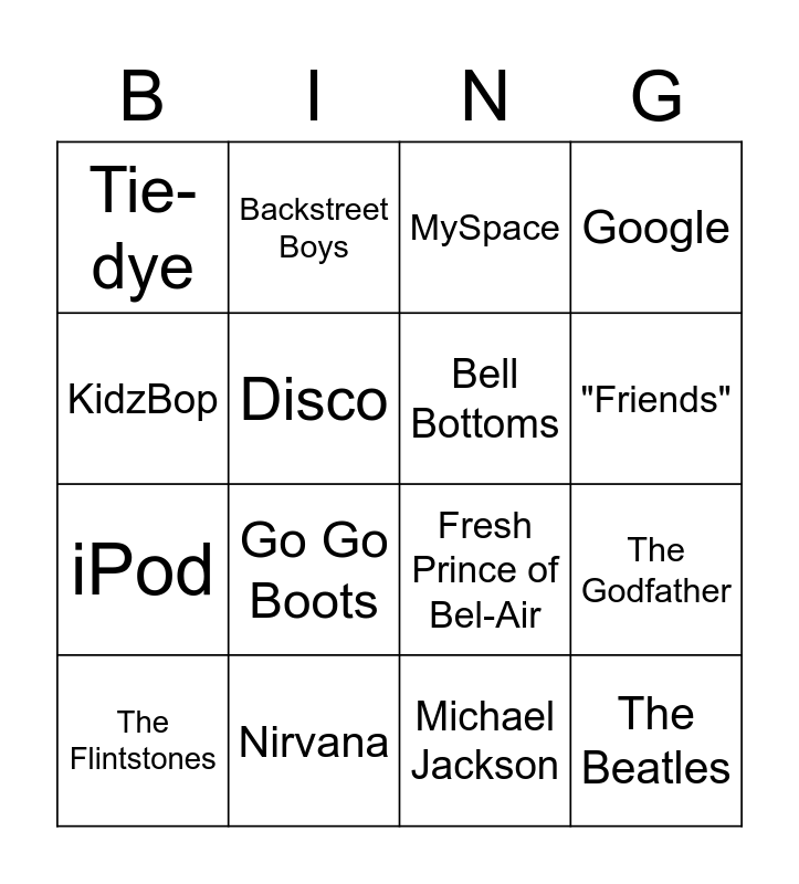 This bingo card has 16 words: Nirvana, The Godfather, MySpace, Tie-dye, iPod, Backstreet Boys, Fresh Prince of Bel-Air, Michael Jackson, KidzBop, Disco, The Flintstones, Google, Go Go Boots, "Friends", Bell Bottoms and The Beatles.