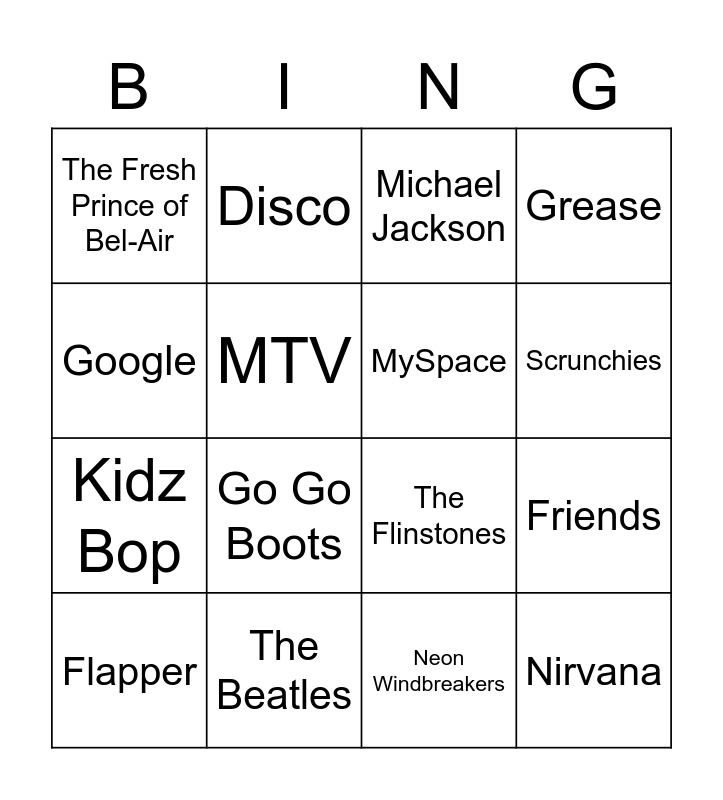 This bingo card has 16 words: The Beatles, Friends, Michael Jackson, The Fresh Prince of Bel-Air, Kidz Bop, Disco, The Flinstones, Neon Windbreakers, Google, MTV, Flapper, Grease, Go Go Boots, Scrunchies, MySpace and Nirvana.