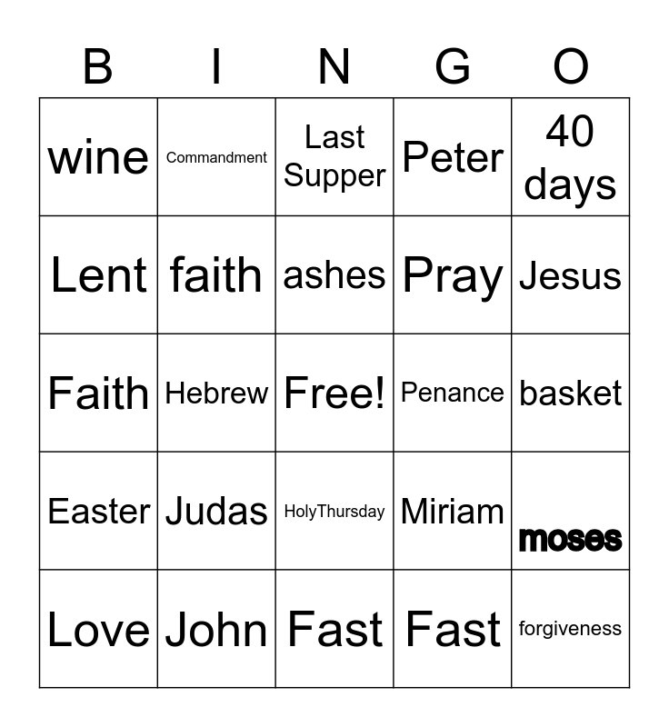 This bingo card has a free space and 28 words: moses, Good Friday, Pray, Fast, Lent, Last Supper, Commandment, Easter, Penance, Love, Faith, Peter, John, Fast, Jesus, Eucharist, Judas, faith, ashes, HolyThursday, wine, cross, forgiveness, Hebrew, basket, Miriam, 40 days and Eucharist.