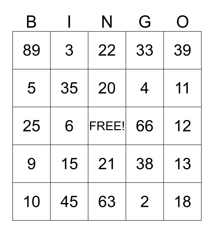 This bingo card has a free space and 24 words: 15, 45, 20, 10, 39, 89, 5, 3, 66, 21, 4, 25, 38, 13, 35, 2, 12, 22, 11, 6, 18, 9, 33 and 63.