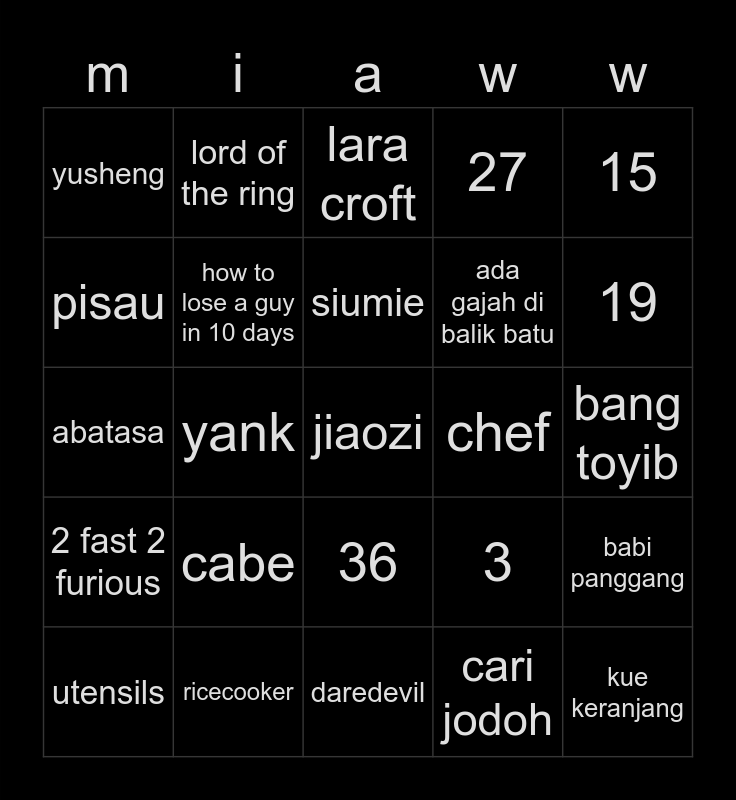This bingo card has a free space and 24 words: cabe, ricecooker, siumie, utensils, 15, yusheng, pisau, lord of the ring, chef, 36, ada gajah di balik batu, abatasa, 3, babi panggang, how to lose a guy in 10 days, cari jodoh, bang toyib, lara croft, 19, yank, kue keranjang, 2 fast 2 furious, 27 and daredevil.