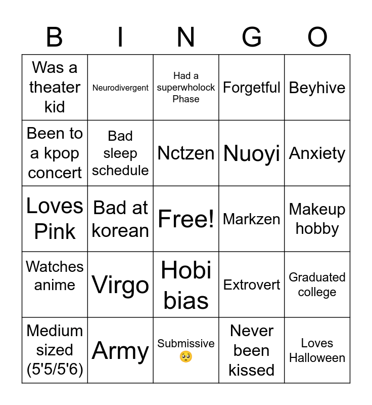This bingo card has a free space and 24 words: Virgo, Army, Nctzen, Medium sized (5'5/5'6), Beyhive, Was a theater kid, Been to a kpop concert, Neurodivergent, Markzen, Hobi bias, Nuoyi, Loves Pink, Extrovert, Graduated college, Bad sleep schedule, Never been kissed, Makeup hobby, Had a superwholock Phase, Anxiety, Bad at korean, Loves Halloween, Watches anime, Forgetful and Submissive 🥺.