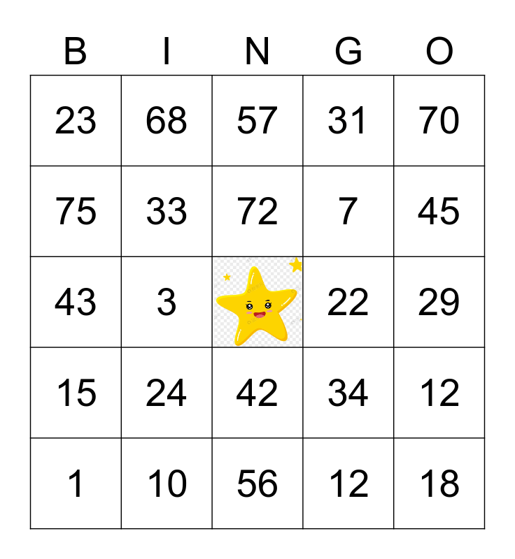 This bingo card has a free space and 24 words: 1, 24, 72, 12, 70, 23, 68, 57, 22, 29, 43, 33, 34, 12, 75, 10, 56, 31, 45, 15, 3, 42, 7 and 18.