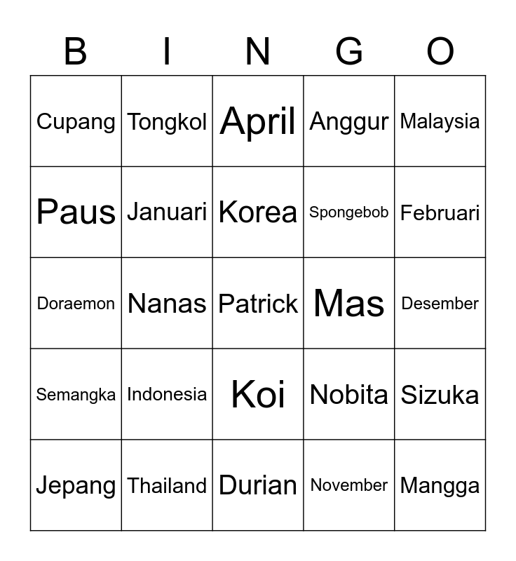 This bingo card has a free space and 24 words: Indonesia, Thailand, Korea, Jepang, Malaysia, Cupang, Paus, Tongkol, Mas, Koi, Spongebob, Doraemon, Nobita, Sizuka, Januari, November, Desember, April, Februari, Nanas, Mangga, Semangka, Anggur and Durian.