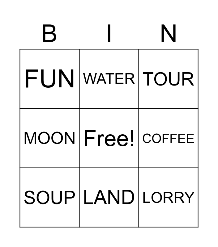 This bingo card has a free space and 8 words: COFFEE, TOUR, WATER, SOUP, FUN, LORRY, MOON and LAND.