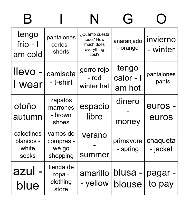 This bingo card has a free space and 24 words: vamos de compras - we go shopping, tienda de ropa - clothing store, gorro rojo - red winter hat, azul - blue, invierno - winter, tengo frío - I am cold, llevo - I wear, pantalones cortos - shorts, dinero - money, verano - summer, tengo calor - I am hot, otoño - autumn, primavera - spring, chaqueta - jacket, camiseta - t-shirt, blusa - blouse, euros - euros, ¿Cuánto cuesta todo? How much does everything cost?, pantalones - pants, zapatos marrones - brown shoes, pagar - to pay, calcetines blancos - white socks, anaranjado - orange and amarillo - yellow.