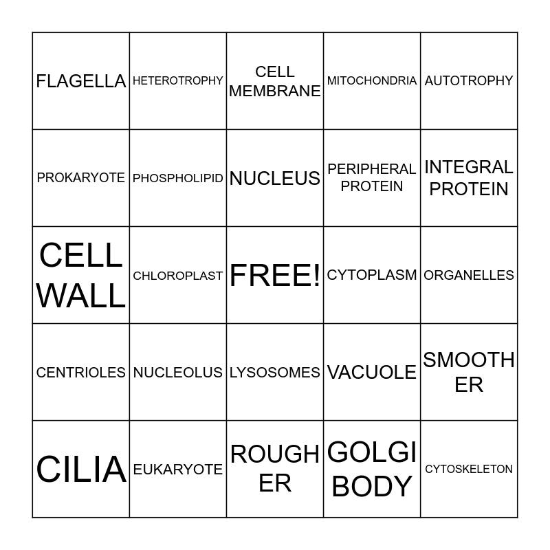 This bingo card has a free space and 24 words: NUCLEOLUS, EUKARYOTE, NUCLEUS, CILIA, AUTOTROPHY, FLAGELLA, PROKARYOTE, HETEROTROPHY, CYTOPLASM, LYSOSOMES, PERIPHERAL PROTEIN, CELL WALL, VACUOLE, SMOOTH ER, PHOSPHOLIPID, GOLGI BODY, ORGANELLES, CELL MEMBRANE, INTEGRAL PROTEIN, CHLOROPLAST, CYTOSKELETON, CENTRIOLES, MITOCHONDRIA and ROUGH ER.