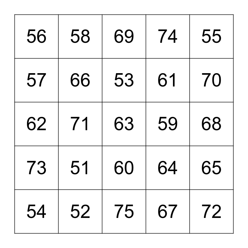 This bingo card has a free space and 24 words: 51, 52, 53, 54, 55, 56, 57, 58, 59, 60, 61, 62, 64, 65, 66, 67, 68, 69, 70, 71, 72, 73, 74 and 75.