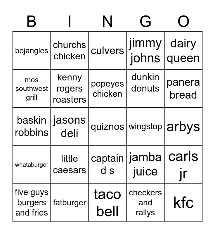 This bingo card has a free space and 59 words: qdoba mexican grill, fatburger, popeyes louisiana kitchen, in n out burger, carls jr, dominos pizza, kenny rogers roasters, sonic drive in, wingstop, harddes, mos southwest grill, steak n shake, dunkin donuts, white castle, krispy kreme, churchs chicken, popeyes chicken, jimmy johns, burger king, baskin robbins, jasons deli, culvers, long john silvers, arbys, starbucks, pizza hut, captain d s, panda express, dairy queen, taco cabana, papa murphys, chick fill a, nathans famous, mcdonalds, bojangles, roy rogers restaurants, chipotle mexican grill, jamba juice, papa johns, whataburger, tim hortons, taco bell, checkers and rallys, del taco, red rooster, subway, wendys, zaxbys, panera bread, five guys burgers and fries, cicis pizza, smoothie king, boston market, kfc, el pollo loco, little caesars, a and w restaurants, jack in the box and taco bueno.