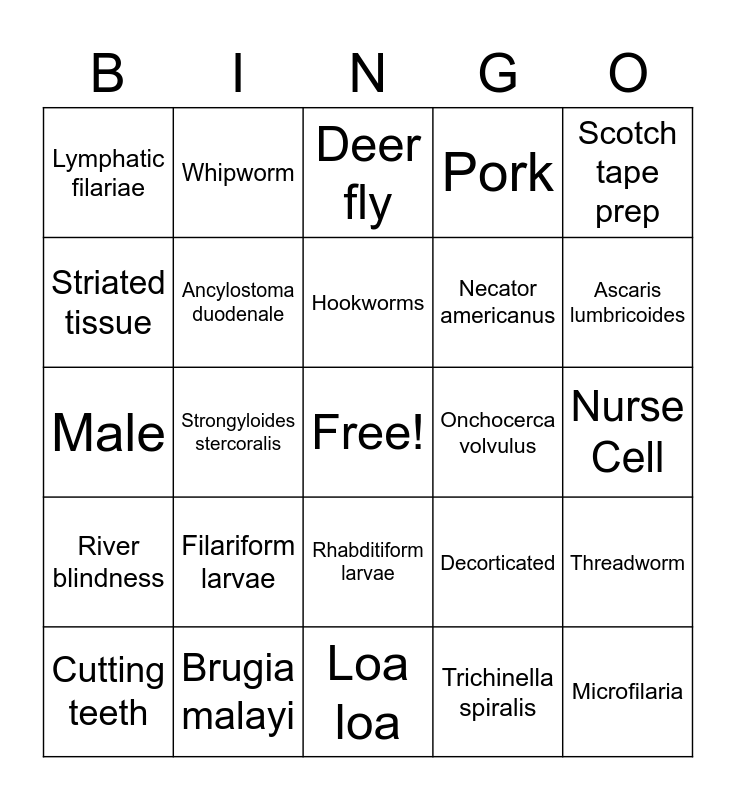 This bingo card has a free space and 32 words: Trichinella spiralis, Enterobius vermicularis, Strongyloides stercoralis, Trichuris trichiura, River blindness, Ancylostoma duodenale, Scotch tape prep, Threadworm, Whipworm, Pinworm, Hookworms, Deer fly, Cutting plates, Female, Onchocerca volvulus, Mammillated, Cutting teeth, Male, Rhabditiform larvae, Filariform larvae, Decorticated, Skin snips, Nurse Cell, Brugia malayi, Microfilaria, Pork, Necator americanus, Striated tissue, Lymphatic filariae, Loa loa, African eye worm and Ascaris lumbricoides.