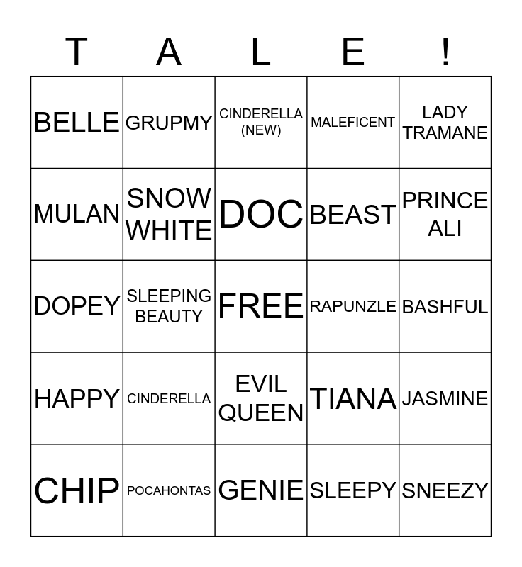 This bingo card has a free space and 24 words: CINDERELLA, POCAHONTAS, DOC, CHIP, LADY TRAMANE, BELLE, MULAN, GRUPMY, RAPUNZLE, EVIL QUEEN, BEAST, DOPEY, TIANA, JASMINE, SNOW WHITE, SLEEPY, BASHFUL, CINDERELLA (NEW), PRINCE ALI, SLEEPING BEAUTY, SNEEZY, HAPPY, MALEFICENT and GENIE.