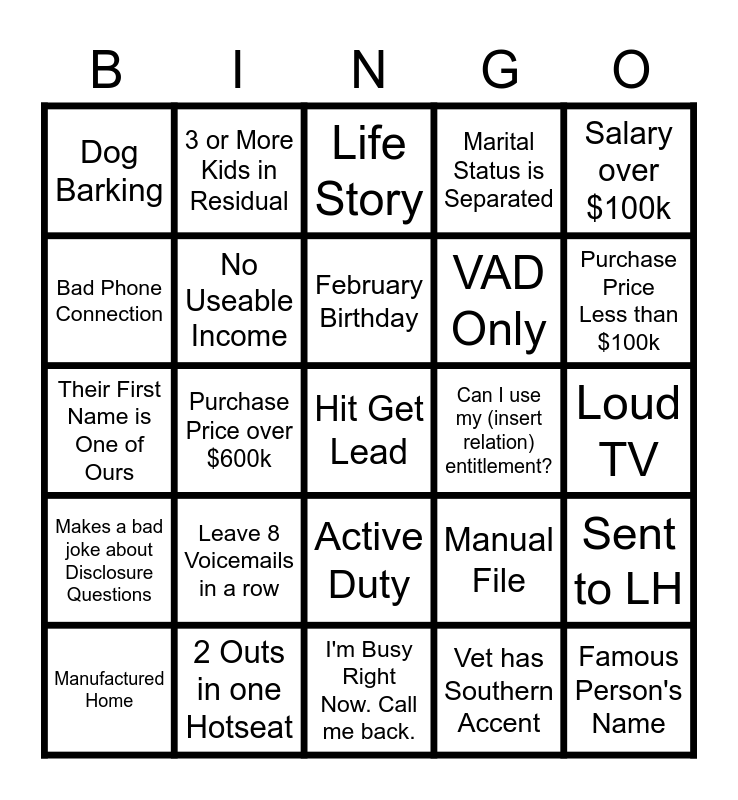 This bingo card has a free space and 24 words: Leave 8 Voicemails in a row, 2 Outs in one Hotseat, February Birthday, Manufactured Home, Salary over $100k, Dog Barking, Bad Phone Connection, 3 or More Kids in Residual, Can I use my (insert relation) entitlement?, Active Duty, VAD Only, Their First Name is One of Ours, Manual File, Sent to LH, No Useable Income, Vet has Southern Accent, Loud TV, Life Story, Purchase Price Less than $100k, Purchase Price over $600k, Famous Person's Name, Makes a bad joke about Disclosure Questions, Marital Status is Separated and I'm Busy Right Now. Call me back..