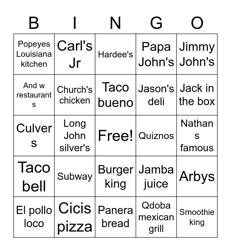 This bingo card has a free space and 60 words: Wendy's, Cicis pizza, Fatburger, Taco bell, Qdoba mexican grill, In n out burger, Church's chicken, Papa Murphy's, Jason's deli, Wingstop, Papa John's, Sonic drive-in, And w restaurant s, Tim Hortons, Red rooster, Popeyes Louisiana kitchen, Smoothie king, Jimmy John's, Dairy Queen, Taco bueno, Quiznos, Hardee's, El pollo loco, Arbys, Checkers and rally's, Chipotle Mexican grill, Zaxbys, Popeyes chicken, Jack in the box, Del taco, Panda express, Captain D's, White castle, Moes Southwest grill, Carl's Jr, Bojangels, Dunkin donuts, Long John silver's, Baskin Robbins, Culver s, Roy Rogers restaurant s, Subway, Nathan s famous, McDonald's, Jamba juice, Kfc, Boston market, Five guys burgers and fries, Starbucks, Burger king, Panera bread, Little Caesars, Whataburger, Pizza hut, Taco cabana, Steak n shake, Kenny Rogers roaster's, Dominos pizza, Krispy Kreme and Chick fill a.