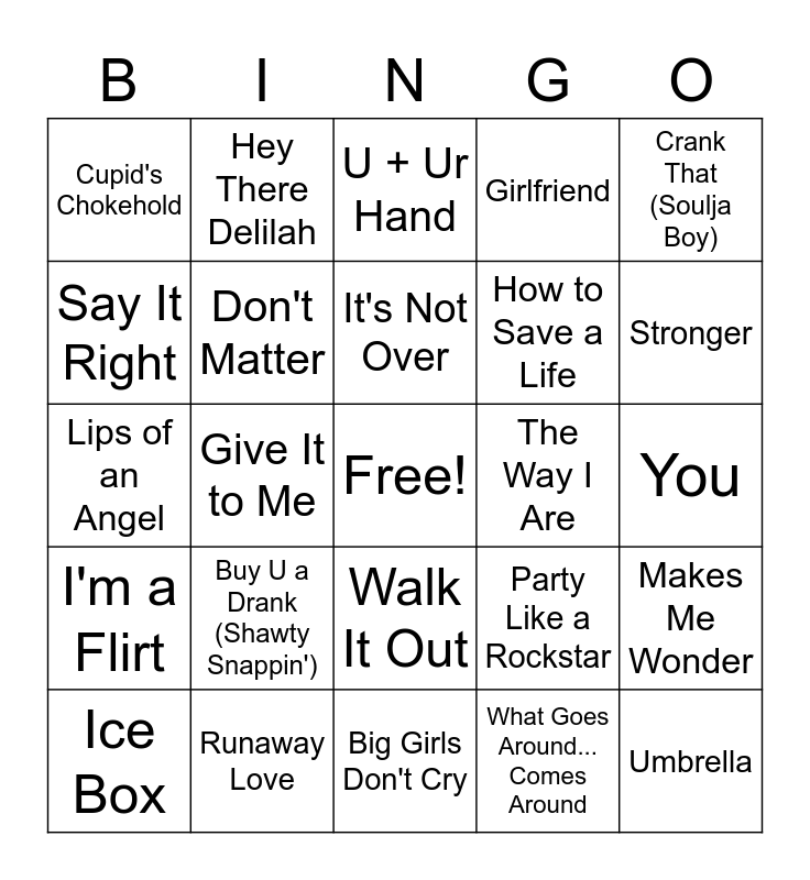 This bingo card has a free space and 50 words: Irreplaceable, Umbrella, The Sweet Escape, Big Girls Don't Cry, Buy U a Drank (Shawty Snappin'), Before He Cheats, Hey There Delilah, I Wanna Love You, Say It Right, Glamorous, Don't Matter, Girlfriend, Makes Me Wonder, Party Like a Rockstar, Smack That, This Is Why I'm Hot, It's Not Over, The Way I Are, Fergalicious, Crank That (Soulja Boy), Give It to Me, What Goes Around... Comes Around, Cupid's Chokehold, How to Save a Life, Home, My Love, Stronger, We Fly High, U + Ur Hand, Walk It Out, Beautiful Girls, This Ain't a Scene, It's an Arms Race, Bartender, Pop, Lock & Drop It, Runaway Love, Rockstar, Thnks fr th Mmrs, What I've Done, Summer Love, You, Wait for You, Last Night, Make It Rain, Make Me Better, Ice Box, Lips of an Angel, Waiting on the World to Change, Lost Without U, I'm a Flirt and If Everyone Cared.