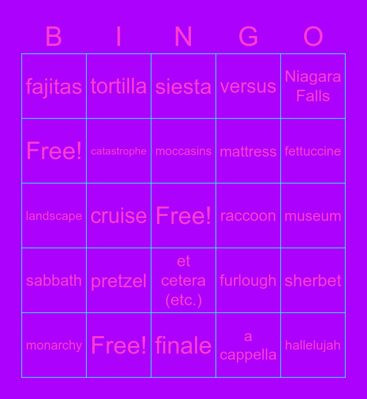 This bingo card has a free space and 26 words: dachshund, pretzel, finale, a cappella, fettuccine, fajitas, tortilla, siesta, mattress, sherbet, landscape, cruise, furlough, hallelujah, sabbath, manna, moccasins, raccoon, Niagara Falls, monarchy, catastrophe, et cetera (etc.), versus, museum, Free! and Free!.