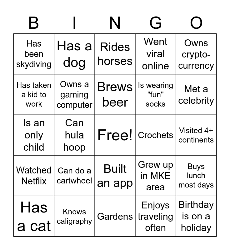 This bingo card has a free space and 50 words: Sends Christmas cards, Birthday is on a holiday, Started a business, Gardens, Can do a cartwheel, Ran in a half or full marathon, Has a dog, Is a twin or triplet, Has taken a kid to work, Has a pen pal, Owns a gaming computer, Went viral online, Buys lunch most days, Grew up in MKE area, Taught a class, In a sports league, Brews beer, Crochets, Is a notary public, Owns crypto-currency, Can hula hoop, Enjoys traveling often, Has been skydiving, Is wearing "fun" socks, Speaks a second language fluently, Knows ASL, Met a celebrity, Knows how to surf, Rides horses, Built an app, Has a side hustle, Has a nickname, Is left handed, Read 10+ books this year, Knows caligraphy, Can code, Bikes to work, Has taken dance lessons, Bakes, Visited 4+ continents, Visited 40+ states, Worked in a research lab before, Has been to the olympics, Plays an intrument, Has a cat, Is an only child, Hs been ice fishing, Has been to Mexico, Watched Netflix and Owns shorts.