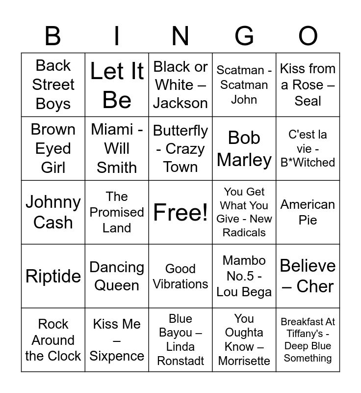 This bingo card has a free space and 77 words: Badlands, Radioactive, Black or White – Jackson, Don’t stop me now – Queen, Friends in Low Places, Eagles, Elvis Presley, Bohemian Rhapsody, Bon Jovi, Love Me Tender, Pink Cadillac, Friday I'm In Love - The Cure, Butterfly - Crazy Town, Brown Eyed Girl, Eye of the Tiger, The Promised Land, Fast Car, Breakfast At Tiffany's - Deep Blue Something, Sweet Caroline, Kiss from a Rose – Seal, My Hometown, Johnny Cash, Miami - Will Smith, Let It Be, Scatman - Scatman John, Good Riddance (Time of Your Life) - Green Day, We Are the Champions, Two Princes - Spin Doctors, RESPECT, Born in the USA, Piano Man, Don't Stop Believing, Imagine, Mambo No.5 - Lou Bega, C'est la vie - B*Witched, Bob Marley, Hey Jude, The Beatles, American Pie, You Oughta Know – Morrisette, I want it that Way, Livin' on a Prayer, Hey there Delilah, This land is your Land, It's a Small World, Like a Prayer, Rock Around the Clock, Back Street Boys, Mr. Jones - Counting Crows, Jessie's Girl, Hotel California, Good Vibrations, Stand by Me, Take Me Home Country Road, Groove Is in the Heart - Deee-Lite, Everything I Do - Bryan Adams, Lucky - Jason Mraz, Lynard Skynard, Plain white T's, I'm a Believer, Dancing Queen, Hound Dog, Vogue - Madonna, MMMBop – Hanson, What a Wonderful World, All Star - Smash Mouth, Bye Bye Bye - *NSYNC, You Get What You Give - New Radicals, Thunder Road, Don't Look Back in Anger – Oasis, Blue Suede Shoes, Believe – Cher, Riptide, Kiss Me – Sixpence, Bruno Mars, Blue Bayou – Linda Ronstadt and Hooked on a feeling – Blue Swede.