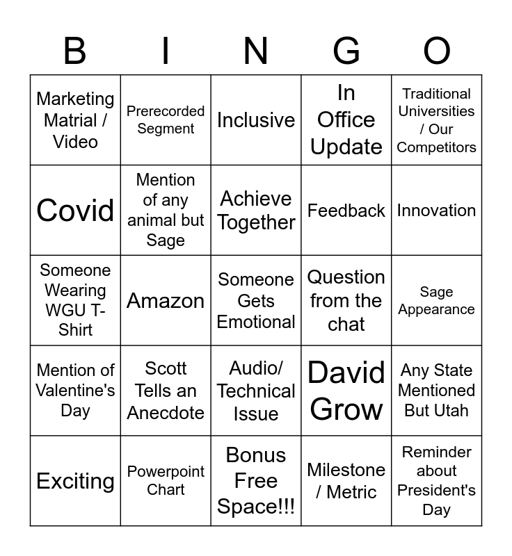 This bingo card has a free space and 24 words: Scott Tells an Anecdote, Powerpoint Chart, Achieve Together, Exciting, Traditional Universities / Our Competitors, Marketing Matrial / Video, Covid, Prerecorded Segment, Question from the chat, Audio/ Technical Issue, Feedback, Someone Wearing WGU T-Shirt, David Grow, Any State Mentioned But Utah, Mention of any animal but Sage, Milestone / Metric, Sage Appearance, Inclusive, Innovation, Amazon, Reminder about President's Day, Mention of Valentine's Day, In Office Update and Bonus Free Space!!!.