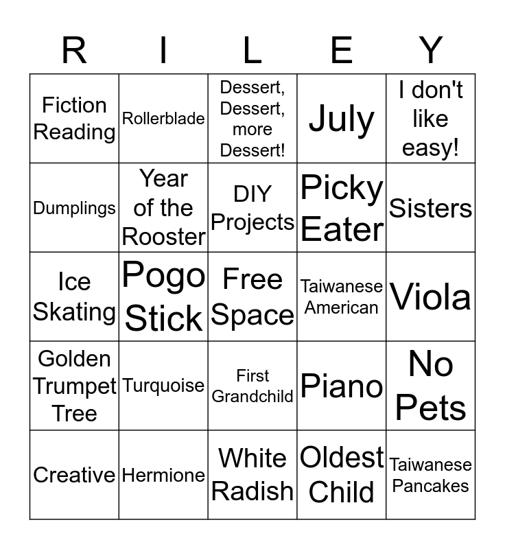 This bingo card has a free space and 24 words: Turquoise, Hermione, DIY Projects, Creative, I don't like easy!, Fiction Reading, Dumplings, Rollerblade, Taiwanese American, First Grandchild, Picky Eater, Ice Skating, Piano, No Pets, Year of the Rooster, Oldest Child, Viola, Dessert, Dessert, more Dessert!, Sisters, Pogo Stick, Taiwanese Pancakes, Golden Trumpet Tree, July and White Radish.