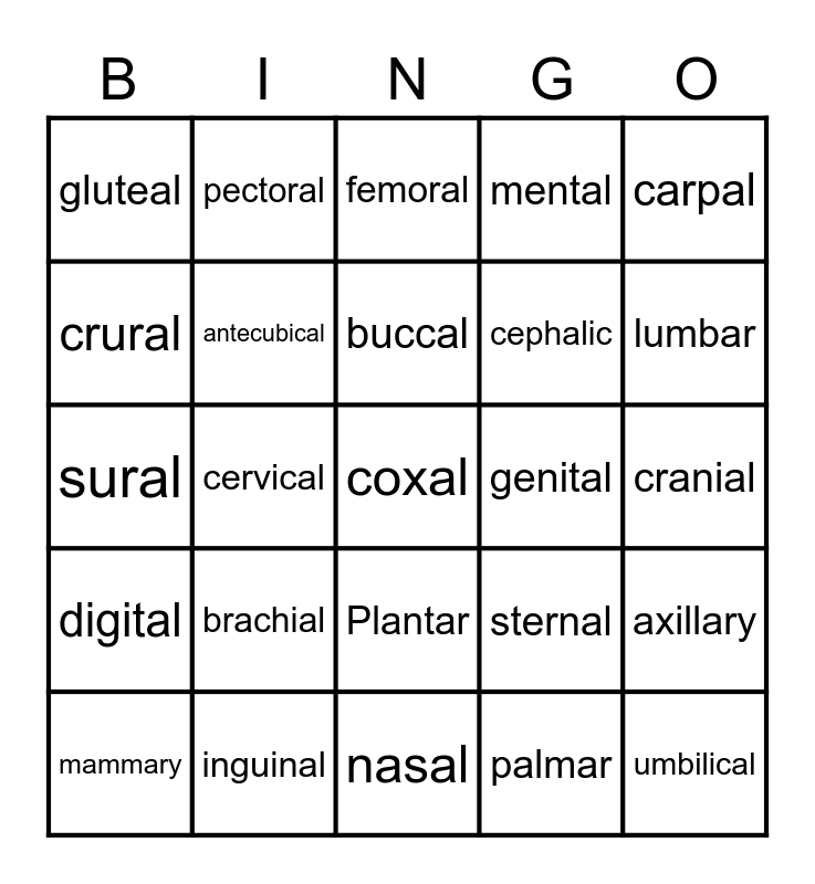 This bingo card has 38 words: abdominal, acromial, antebrachial, antecubical, axillary, brachial, buccal, calcaneal, carpal, cephalic, cervical, mental, coxal, cranial, crural, digital, otic, femoral, frontal, genital, gluteal, inguinal, lumbar, mammary, popliteal, nasal, umbilical, occipital, sacral, oral, orbital, Plantar, palmar, pectoral, pedal, sternal, sural and petellar.