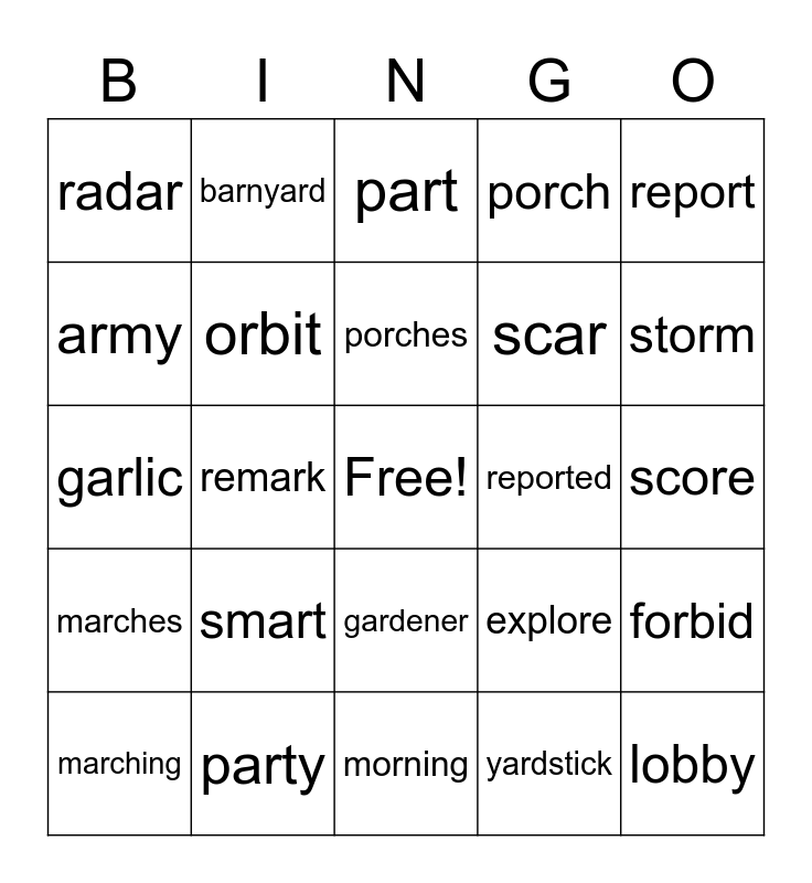 This bingo card has a free space and 24 words: smart, party, porches, marching, report, radar, army, barnyard, reported, gardener, scar, garlic, explore, forbid, orbit, yardstick, score, part, storm, remark, lobby, marches, porch and morning.