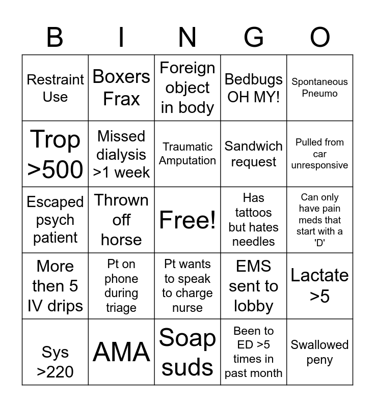 This bingo card has a free space and 42 words: Bgl >500, Traumatic Amputation, Wants free UPT, Pt on phone during triage, Been to ED >5 times in past month, Lactate >5, Swallowed peny, Vag itching, Foreign object in body, Pt wants to speak to charge nurse, Can only have pain meds that start with a 'D', Pulled from car unresponsive, Thrown off horse, Spontaneous Pneumo, Threatens to go to other hospital, EMS sent to lobby, "I'm a hard stick", Escaped psych patient, Priapism, Boxers Frax, Trop >500, Pt rings call bell >5 times in 1 hour, No ride home, Restraint Use, LOS >30 mins, Power tool injury, Sandwich request, Fever >104, SVT, Needs work note, Pain score >10/10, More then 5 IV drips, Missed dialysis >1 week, Soap suds, K+ >6, Sys >220, AMA, Has tattoos but hates needles, Allergic to greater then 10 meds, Only US IVs, Bedbugs OH MY! and ETOH >350.
