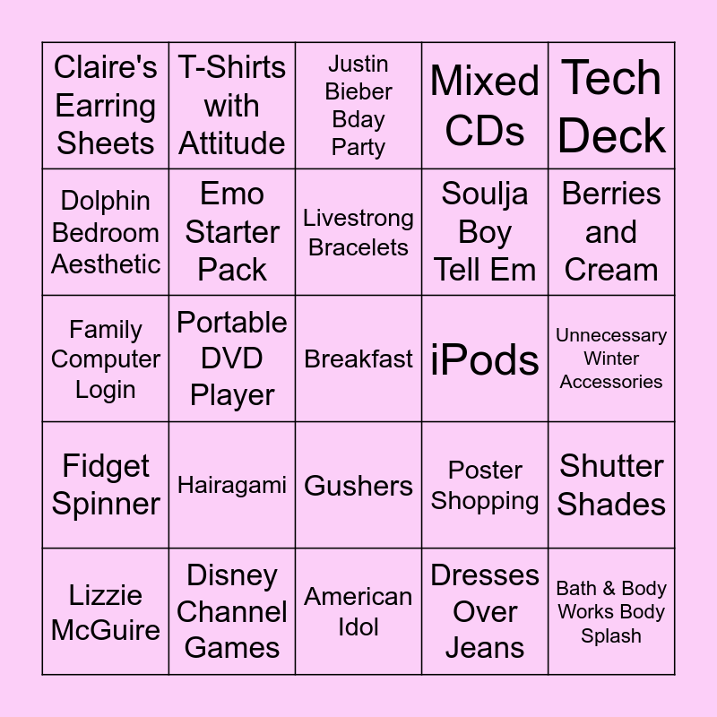 This bingo card has 29 words: Lizzie McGuire, Bedazzled Cellies, Portable DVD Player, Bath & Body Works Body Splash, Claire's Earring Sheets, Justin Bieber Bday Party, Emo Starter Pack, Hairagami, iPods, Disney Channel Games, Unnecessary Winter Accessories, Breakfast, American Idol, Dresses Over Jeans, Berries and Cream, California Gurls, Gushers, Fidget Spinner, Tech Deck, Family Computer Login, Poster Shopping, DVD Intro, Soulja Boy Tell Em, Dolphin Bedroom Aesthetic, Mixed CDs, T-Shirts with Attitude, Shutter Shades, Livestrong Bracelets and 2000's Comedies.