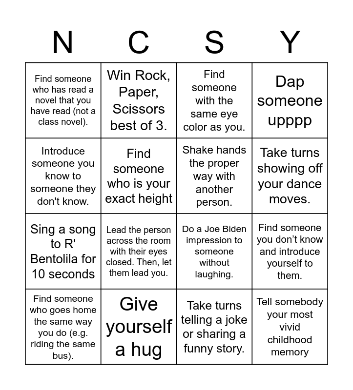 This bingo card has 27 words: Speak 5 or more words to someone in a foreign accent, Find someone who likes the same type of bagel as you, Sing a song to R' Bentolila for 10 seconds, Have a staring contest for one whole minute without talking., Find someone who is your exact height, Find someone with the same eye color as you., Win Rock, Paper, Scissors best of 3., Tell somebody your most vivid childhood memory, Give yourself a hug, Share your best animal impression with someone., Do a Joe Biden impression to someone without laughing., Dap someone upppp, Find someone who likes the same TV show or movie as you do., Find someone who is wearing the same color shirt as you are., Lead the person across the room with their eyes closed. Then, let them lead you., Find someone who has the same favorite game as you., Shake hands the proper way with another person., Take turns showing off your dance moves., Teach each other your favorite stretch., Find someone who has read a novel that you have read (not a class novel)., Take turns telling a joke or sharing a funny story., Stand back to back for one whole minute, taking turns describing to each other what you see., Find someone you don’t know and introduce yourself to them., Find someone who goes home the same way you do (e.g. riding the same bus)., Play pattycake with someone., Introduce someone you know to someone they don't know. and Share a story about your summer..