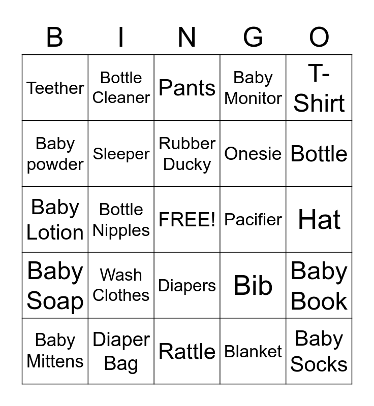 This bingo card has a free space and 24 words: Wash Clothes, Diaper Bag, Rubber Ducky, Baby Mittens, T-Shirt, Teether, Baby powder, Bottle Cleaner, Pacifier, Diapers, Onesie, Baby Lotion, Bib, Baby Book, Sleeper, Blanket, Hat, Pants, Bottle, Bottle Nipples, Baby Socks, Baby Soap, Baby Monitor and Rattle.