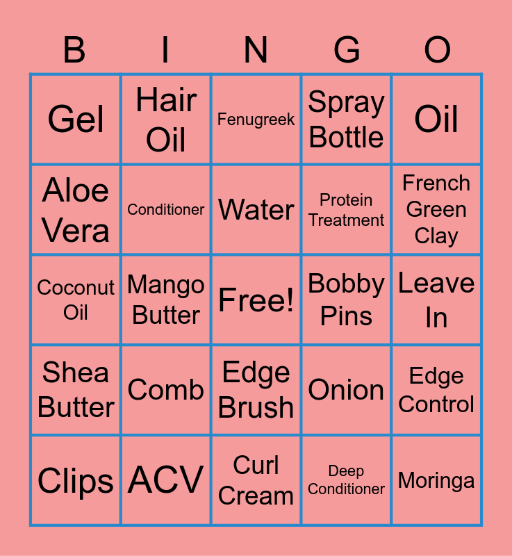This bingo card has a free space and 54 words: Shower Cap, Comb, Scrunchie, Mousse, Leave In, Elastic Bands, Conditioner, Flexi Rods, Spray Bottle, Clay Mask, Gel, Butter, Deep Conditioner, Edge Control, Hair Dryer, Shampoo, Water, Protein Treatment, Brush, Clips, ACV, Curl Cream, Bobby Pins, Oil, Curl Definer, Hair Oil, Edge Brush, Colour Wax, Perm Rods, Amla, Eco Gel, Beads, Spoon, JBCO, Aloe Vera, Jojoba Oil, Fenugreek, Onion, Moringa, Coconut Oil, Heat Cap, Peppermint oil, Lemon Oil, Steam Cap, Rosemary, Rhassoul, Pink Clay, Beeswax, French Green Clay, Shea Butter, Mango Butter, Neem Oil, Flaxseeds and Honey.