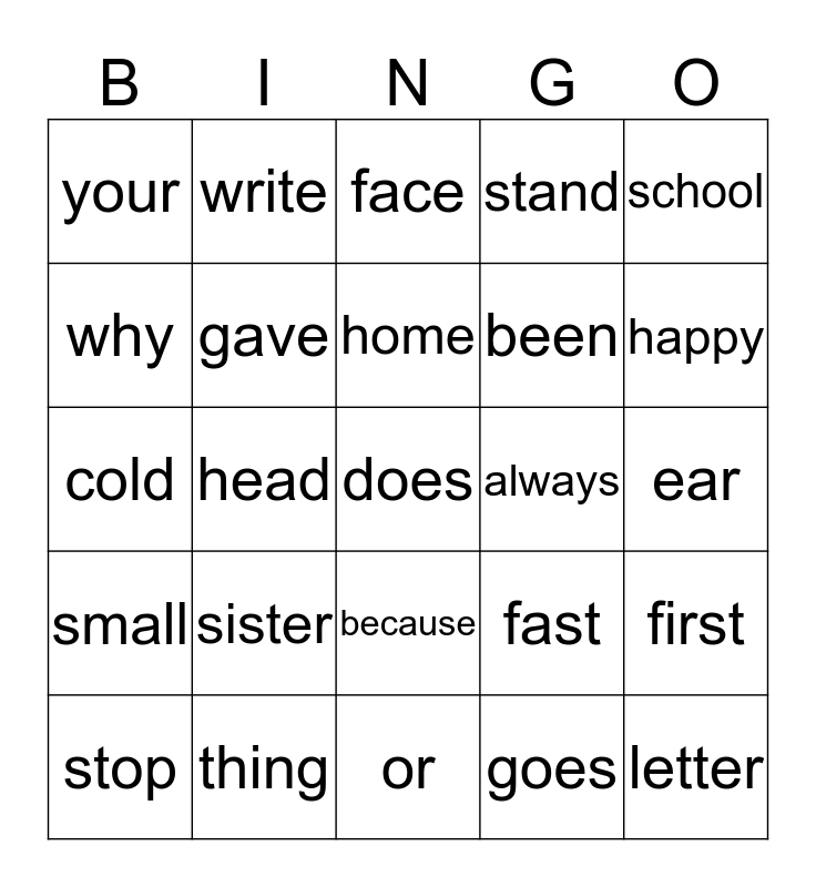 This bingo card has a free space and 24 words: sister, thing, home, stop, school, your, why, write, always, because, been, cold, fast, first, gave, goes, ear, face, happy, head, letter, small, stand and or.