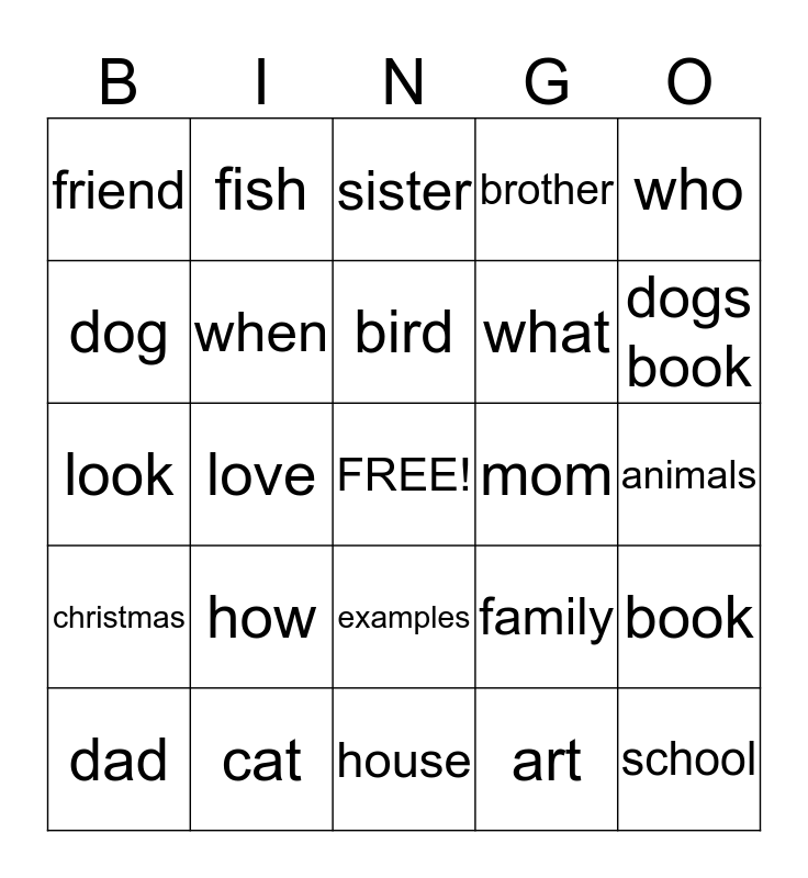 This bingo card has a free space and 24 words: how, cat, bird, dad, who, friend, dog, fish, mom, examples, what, look, family, book, when, art, animals, sister, dogs book, love, school, christmas, brother and house.