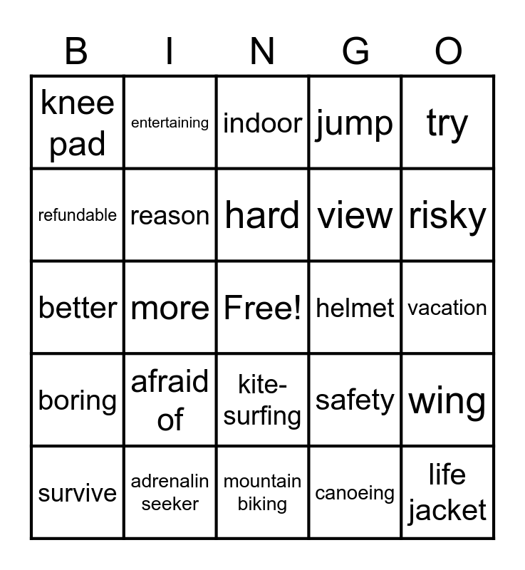 This bingo card has a free space and 60 words: abroad, adrenalin seeker, aircraft, boring, canoeing, caving, reason, skateboarding, view, kayaking, jump, inexperienced, refundable, non-refundable, single, knee pad, life jacket, try, weather, hard, helmet, indoor, survive, wing, river, take place, suitable, adventurous, risky, prefer, would rather, archery, underwater, dangerous, entertaining, amazing, amusing, more, less, better, challenging, afraid of, vacation, danger, safety, equipment, heli-skiing, excited, spent time, kite-surfing, mountain biking, attend, join, trekking, indoor, outdoor, together, holiday, frightening and fond of.