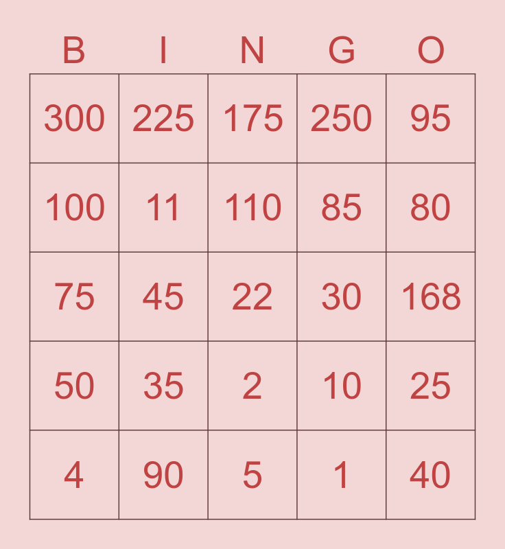 This bingo card has 25 words: 35, 5, 110, 4, 95, 300, 100, 225, 30, 2, 85, 75, 10, 25, 11, 40, 168, 175, 80, 45, 22, 90, 50, 250 and 1.
