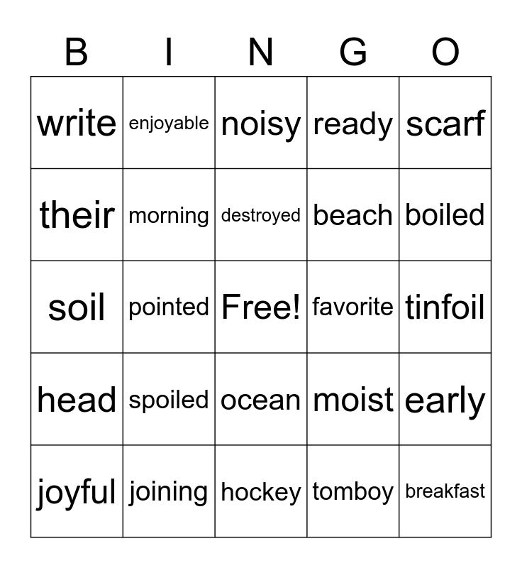 This bingo card has a free space and 24 words: spoiled, joining, destroyed, joyful, scarf, write, their, enjoyable, favorite, ocean, beach, soil, moist, early, morning, tomboy, tinfoil, noisy, boiled, pointed, breakfast, head, ready and hockey.