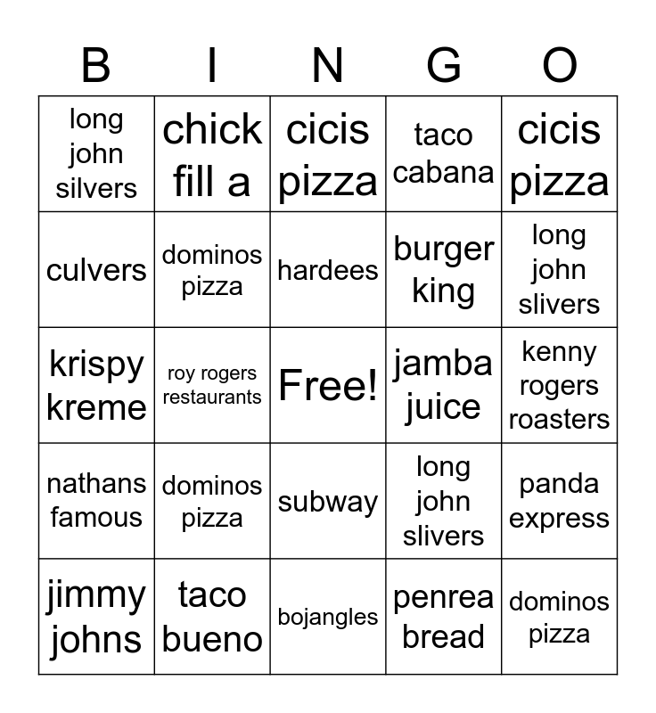 ⚠ This card has duplicate items: carls jr (3), taco bueno (3), jack in the box (3), dunkin donuts (2), dominos pizza (4), red rooster (3), burger king (2), cicis pizza (3), little caesars (2), chipotle mexican grill (2), jamba juice (2), jimmy johns (2), long john slivers (2), krispy kreme (2), starbucks (3), boston market (2), dairy queen (2), subway (2)
