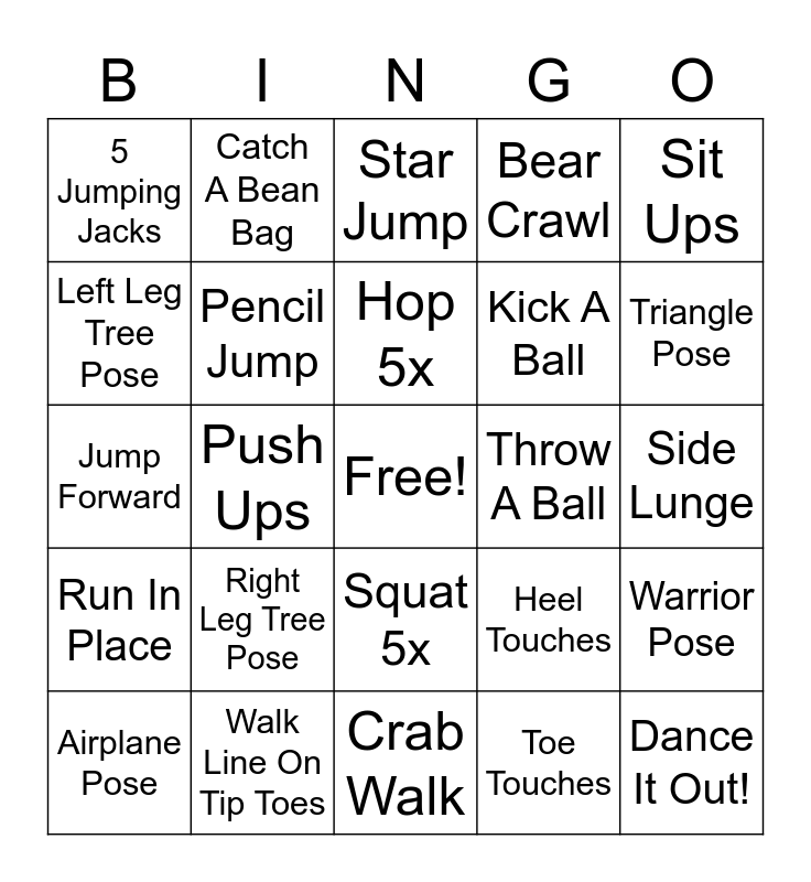 This bingo card has a free space and 24 words: Right Leg Tree Pose, Walk Line On Tip Toes, Hop 5x, Airplane Pose, Sit Ups, 5 Jumping Jacks, Left Leg Tree Pose, Catch A Bean Bag, Throw A Ball, Squat 5x, Kick A Ball, Jump Forward, Heel Touches, Warrior Pose, Pencil Jump, Toe Touches, Side Lunge, Star Jump, Triangle Pose, Push Ups, Dance It Out!, Run In Place, Bear Crawl and Crab Walk.