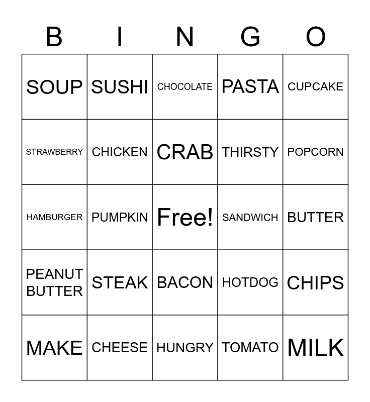This bingo card has a free space and 93 words: MEAT, COOK, HUNGRY, BREAKFAST, LUNCH, DINNER, RESTAURANT, MAKE, LIKE/DON’T, DELICIOUS, GROSS, TASTE, FAST FOOD, THIRSTY, COOKIE, CUPCAKE, CHOCOLATE, CANDY, POP, CAKE, ICE CREAM, SUGAR, DESSERT, DONUT, STEAK, CHICKEN, HAM, FISH, TURKEY, EGGS, CHEESE, BACON, SHRIMP, TOFU, SUSHI, PORK, SAUSAGE, LOBSTER, CRAB, HOTDOG, HAMBURGER, PEANUT BUTTER, BUTTER, YOGURT, MILK, APPLE, ORANGE, GRAPES, PINEAPPLE, AVOCADO, POTATO, TOMATO, CUCUMBER, ONION, MUSHROOM, BANANA, CABBAGE, CHERRY, SPINACH, WATERMELON, PUMPKIN, FRUIT, VEGGIES, CARROT, CORN, PEACH, PEAR, PEAS, STRAWBERRY, RAISINS, BREAD, PRETZEL, CRACKER, PASTA, CEREAL, TOAST, POPCORN, CHIPS, RICE, PIZZA, SALT & PEPPER, KETCHUP & MUSTARD, SANDWICH, SOUP, SALAD, PANCAKE, WAFFLE, TEA, COFFEE, PEPSI, COKE, DR. PEPPER and JUICE.
